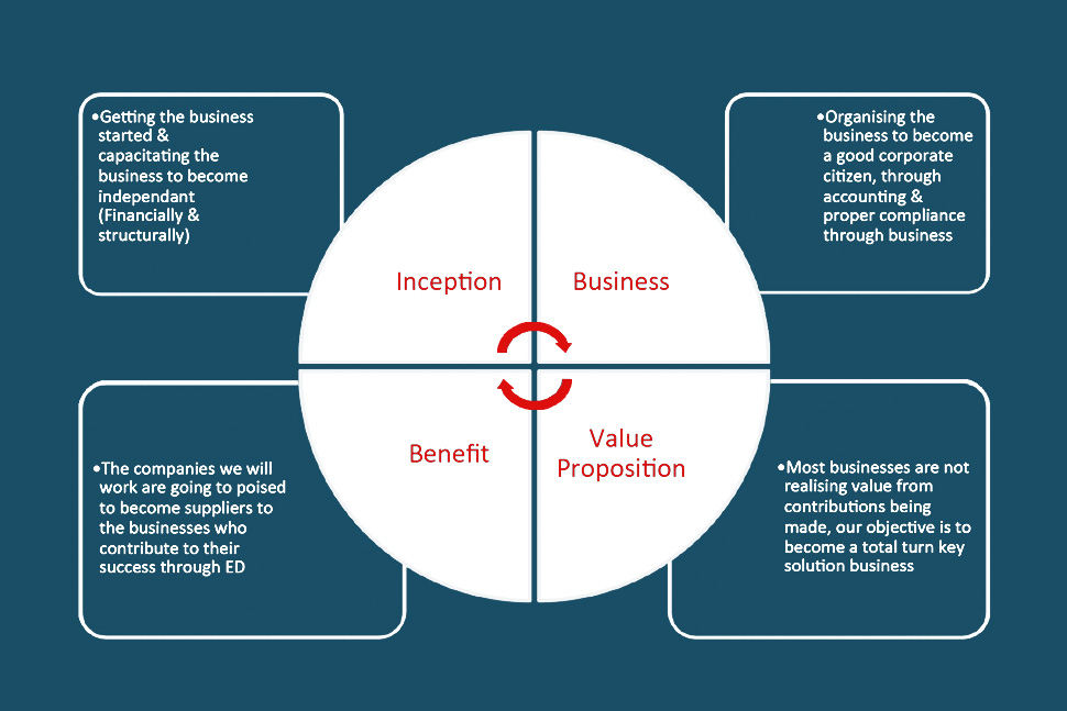 Our primary focus is to engage with businesses who would like to assist small emerging businesses to become financially independent and furthermore become suppliers to these businesses, both fulfilling Enterprise & Supplier Development prescripts as set out by the Department of Trade and Industry. We do not have a specific sector in which we operate thus making our services versatile.